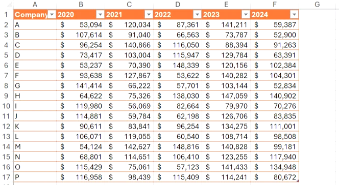 (4) 각 행에는 회사, 연도, 값이 포함되고, 각 열에는 일관된 유형의 데이터가 포함됩니다.