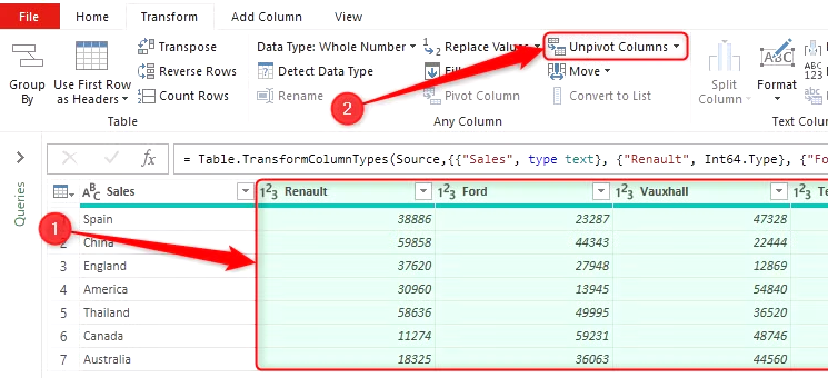 (2) 행으로 바꾸려는 모든 열의 머리글을 선택하고 변형 탭에서 "열 피벗 해제"를 클릭합니다.