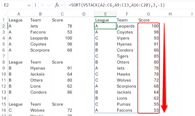 다음과 같은 데이터가 있습니다. 세 리그에 걸친 각 팀의 점수가 포함되어 있습니다. 이제 시즌이 종료되었으므로 VSTACK을 사용하여 모든 팀의 점수를 하나의 연속된 배열로 병합해 보겠습니다.