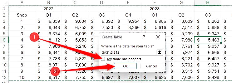 (2) [표 만들기] 대화 상자에서 [머리글 포함] 항목의 선택을 취소하고 [확인]을 클릭합니다.