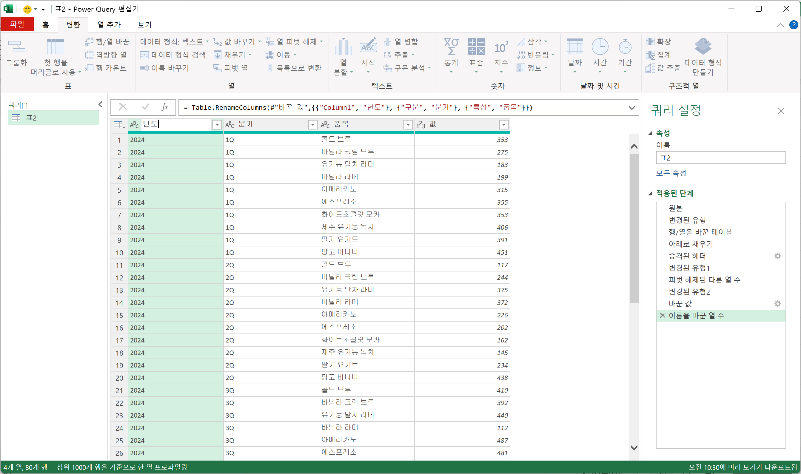 (6) 두 개의 제목 행이 각각 열로 바뀝니다. 즉, 첫 번째 열 헤더(연도)를 구성했던 행은 첫 번째 열, 두 번째 열 헤더(분기)를 구성했던 행은 두 번째 열에 있습니다.