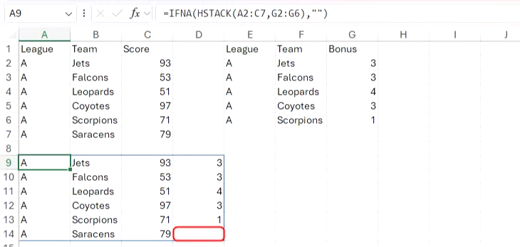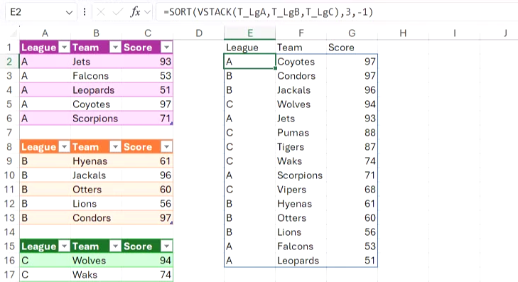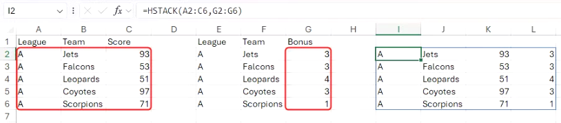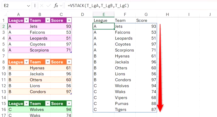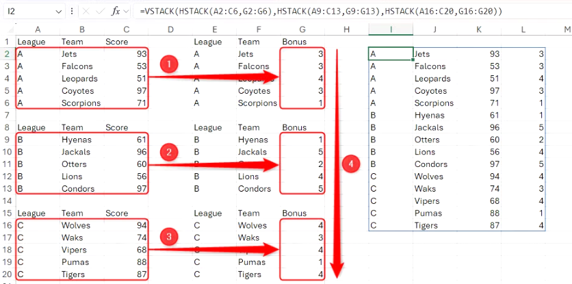 이번에는 먼저 HSTACK을 사용하여 A2:C6까지의 셀에 있는 데이터를 G2:G6까지의 셀에 있는 데이터와 합친 다음, 나머지 두 리그에도 동일한 작업을 수행합니다. 마지막으로, 이 세 개의 HSTACK 배열을 VSTACK을 사용하여 세로로 합칩니다.