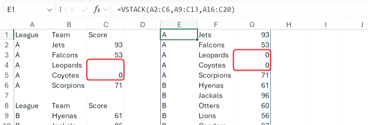 이 예에서 Coyotes는 실격 처리되었으므로 VSTACK 수식 결과에는 Coyotes 의 점수인 0점이 반영되어야 합니다. 그러나 Leopards의 점수는 아직 입력되지 않았으므로 빈칸으로 남겨두어야 합니다. 그러나 VSTACK 함수를 사용하여 각 리그의 데이터를 세로로 추가하면 두 리그 모두 0으로 표시됩니다.