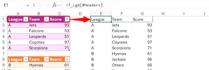 VSTACK 수식 결과 바로 위에 있는 셀 E1에 원래 헤더가 변경되면 자동으로 업데이트되어 첫 번째 배열 위에 있는 헤더 행을 동적으로 복제합니다.