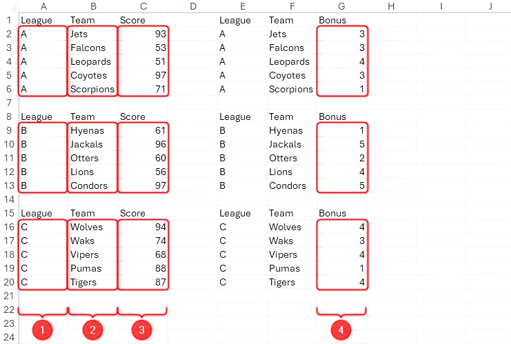 때로는 배열의 일부를 추가하기 위해 단일 수식에서 VSTACK과 HSTACK을 함께 사용해야 할 수도 있습니다. 다음 예에서, 첫 번째 열에 리그, 두 번째 열에 팀, 세 번째 열에 점수, 네 번째 열에 보너스를 넣어 새로운 배열을 만든다고 가정합니다.