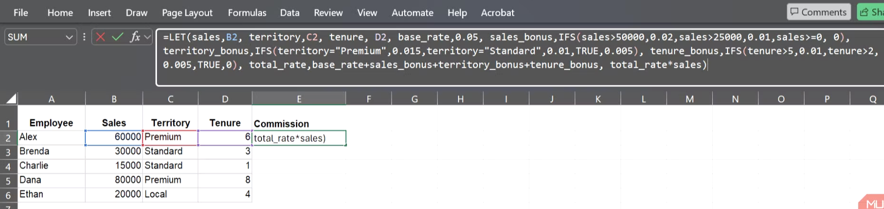 =LET(sales,B2, territory, C2, tenure, D2, base_rate, 0.05, sales_bonus, IFS(sales>50000, 0.02, sales>25000, 0.01, sales>=0, 0), territory_bonus,IFS(territory="Premium", 0.015, territory = "Standard", 0.01, TRUE, 0.005), tenure_bonus,IFS(tenure>5, 0.01, tenure>2, 0.005, TRUE, 0), total_rate, base_rate+sales_bonus + territory_bonus+tenure_bonus, total_rate * sales)