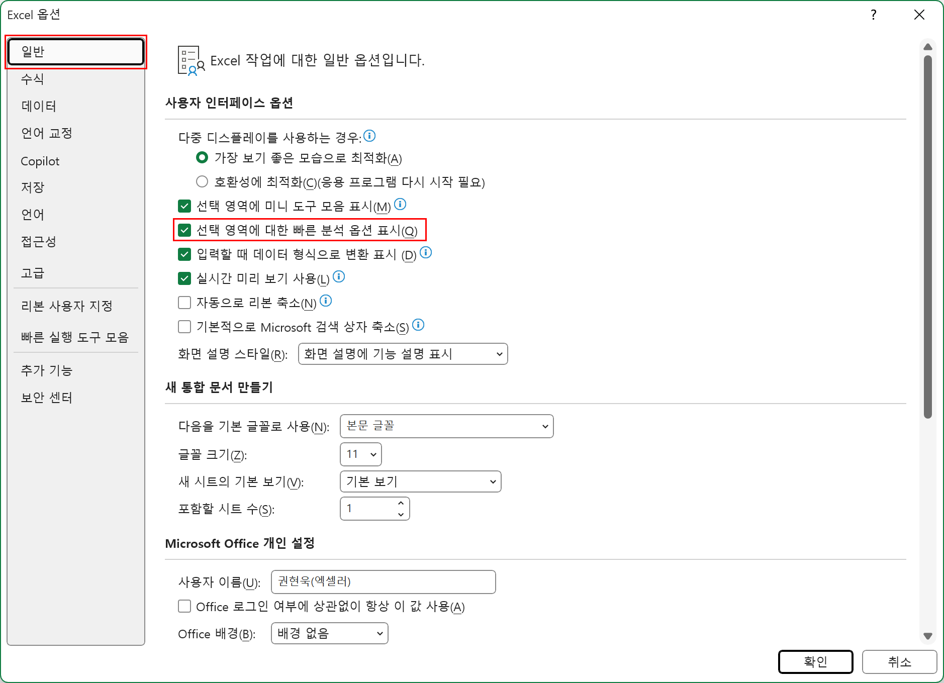 아이콘이 나타나지 않으면 설정에서 비활성화되어 있을 수 있습니다. 활성화하려면 [파일] - [옵션] - [일반]으로 이동하여 [선택 영역에 대한 빠른 분석 옵션 표시] 옆의 확인란이 선택되어 있는지 확인하세요.