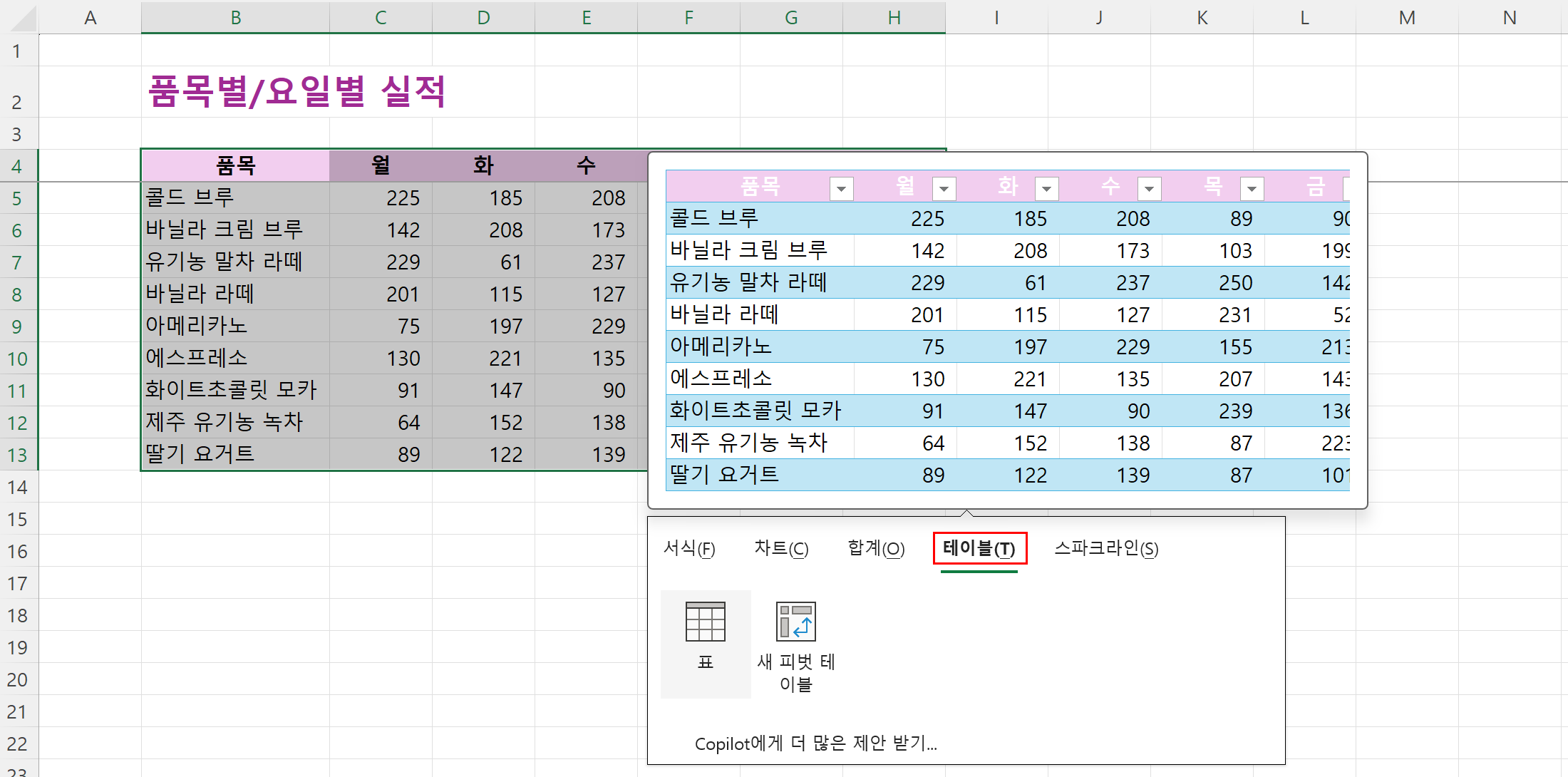 [테이블] 탭은 두 가지 강력한 옵션을 제공합니다. 데이터를 Excel 표로 변환하거나 피벗 테이블을 만드는 것입니다.