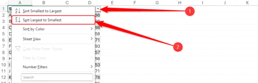 상위 10위에 들지 않은 모든 학생을 포함하는 새로운 데이터 세트를 만들고 싶다고 가정해 보겠습니다. 먼저 열 머리글에서 필터 버튼을 클릭하고 "내림차순 정렬"을 선택하여 점수에 따라 학생을 재정렬합니다.