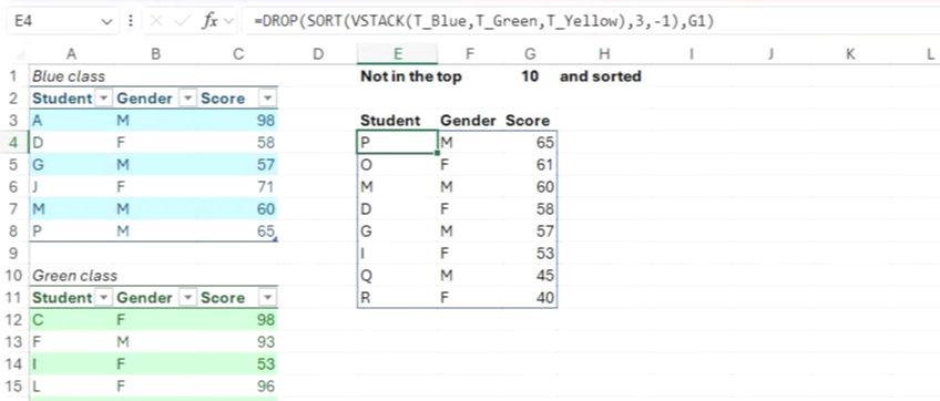 이 표를 개별적으로 분석하는 대신, 모든 학급에서 가장 낮은 점수를 받은 학생들을 추출하여 그룹화하고 싶습니다. 구체적으로, 상위 10위에 들지 않은 모든 학생을 표시하고 동시에 데이터를 정렬하고 싶습니다. 이때 VSTACK 함수가 유용합니다.
