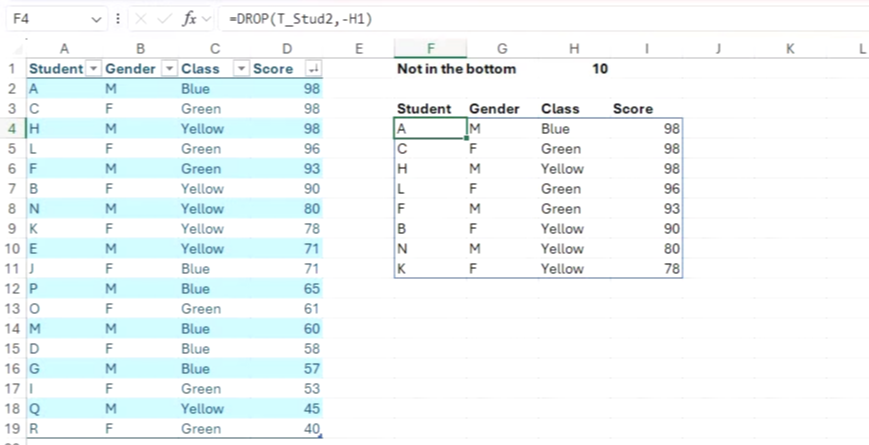 이번에는 하위 10위에 들지 않은 모든 학생을 표시하고 싶다고 가정해 보겠습니다. 이를 위해 T_Stud2 라는 테이블의 데이터를 점수 열을 기준으로 내림차순으로 정렬하고 H1 셀에 10을 입력한 후 다음 수식을 입력합니다.
