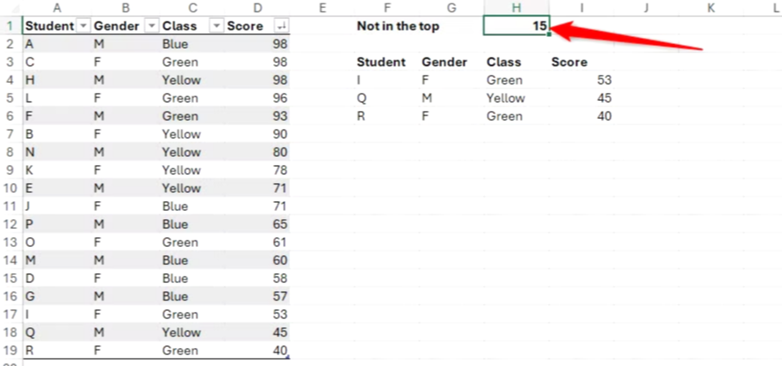 Excel 수식에 값을 하드코딩하는 것의 문제점 중 하나는 유연성이 떨어진다는 것입니다. 즉, 상위 15위에 들지 않은 모든 학생을 표시하려면 수식을 편집해야 합니다. 다음과 같이 셀에 값을 입력하고 수식에서 이를 참조할 수 있습니다.