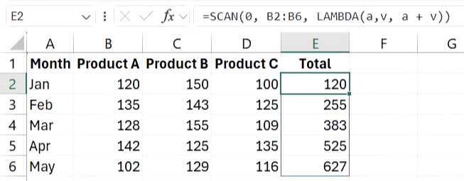 =SCAN(0, B2:B6, LAMBDA(a, v, a + v))