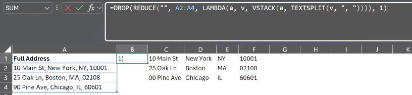 이 수식은 빈 문자열을 누산기로 사용합니다. 각 루프에서 TEXTSPLIT은 쉼표와 공백 구분 기호를 사용하여 현재 주소를 필드로 나누고, VSTACK은 해당 필드를 지금까지 생성된 결과 아래에 세로로 추가합니다. 첫 번째 반복에서 누산기가 비어 있기 때문에 앞에 빈 행이 생성되므로, DROP은 맨 위의 마지막 빈 행을 제거하여 깔끔하게 정렬된 분할 주소 테이블을 남깁니다.