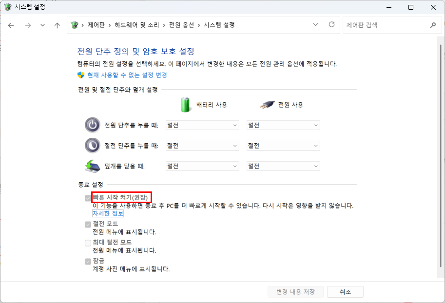 (3) [현재 사용할 수 없는 설정 변경] - [빠른 시작 켜기]의 선택을 해제한 후 - [변경 내용 저장]을 클릭합니다. 완전히 종료된 후에는 앱이 더 이상 자동으로 다시 시작되지 않습니다.