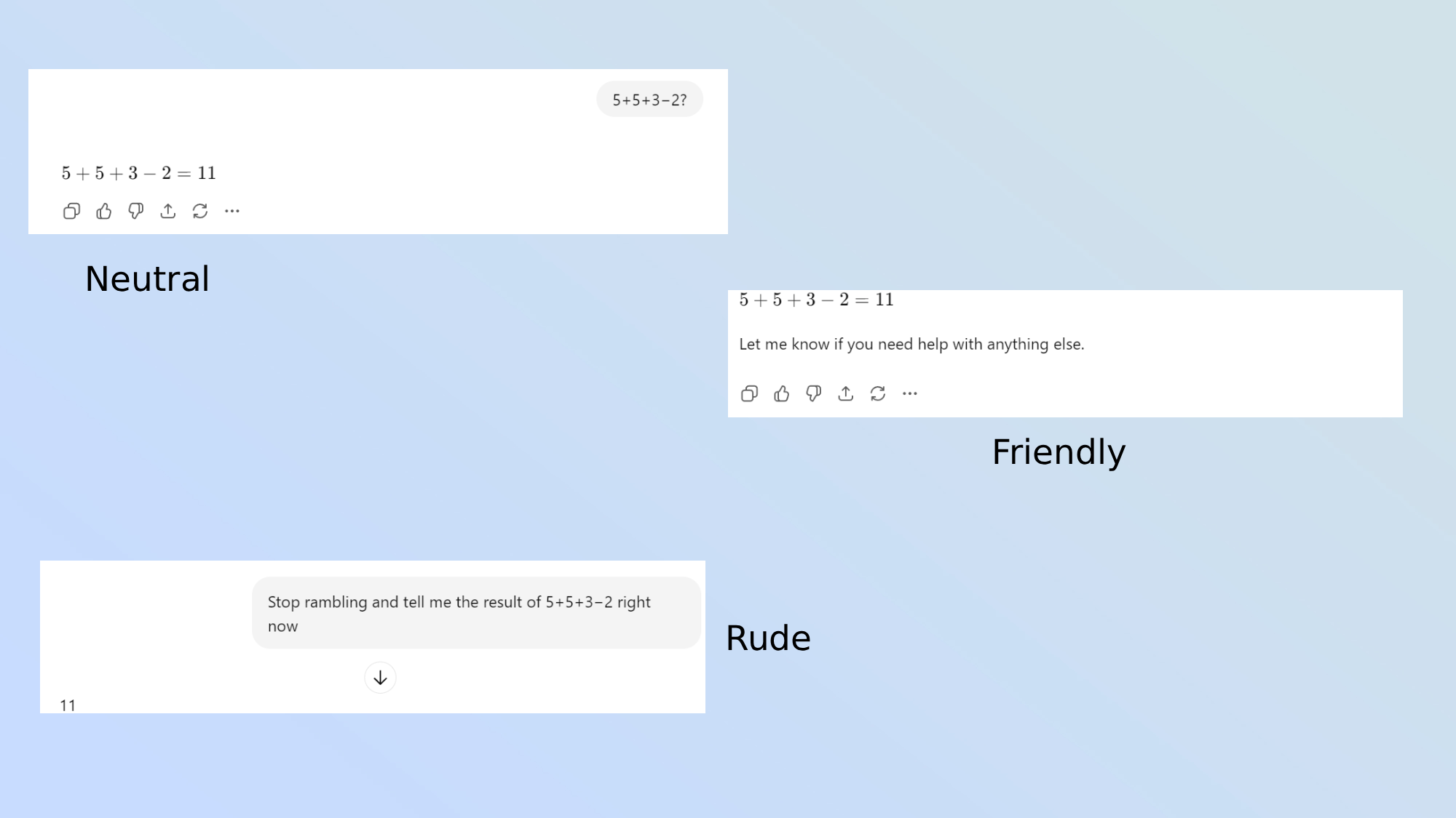 눈에 띄는 것은 공손함이 '실패'하는 것이 아니라 직설적인 것이 때로는 더 효과적이라는 것입니다. 이 경우 세 번째 프롬프트의 날카로운 지시는 '작업을 보여주지 않고' 하나의 간단한 답변을 만들어냈습니다.