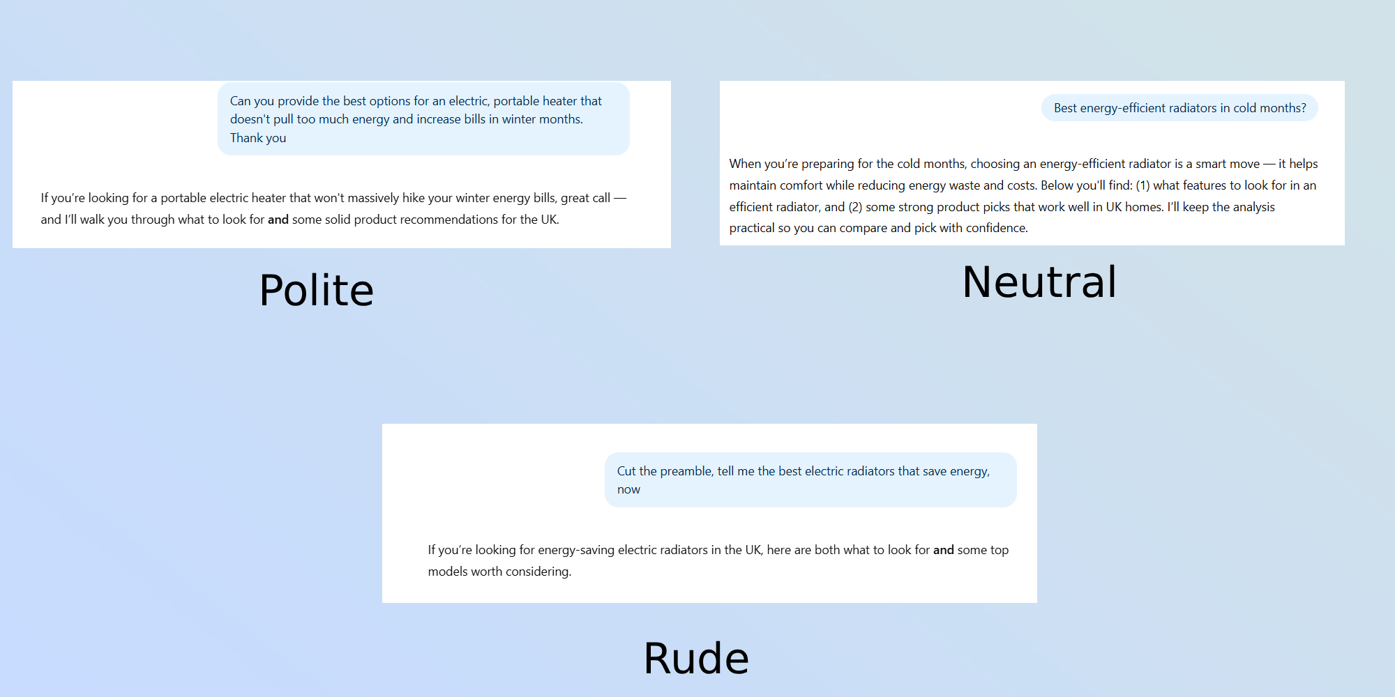 이 세 가지 예의 수준에 따라 ChatGPT의 답변은 길이와 스타일이 달라졌습니다: 정중하고 개방적으로 질문했을 때는 간단하고 상세한 섹션으로 구성된 더 풍부한 설명을 제공했습니다.