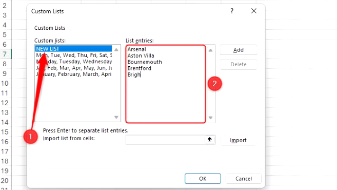 (4) 사용자 지정 목록 창에서 "새 목록"을 클릭하고 목록 항목 필드에 원하는 순서대로 항목을 입력한 후 각 항목을 입력한 후 Enter 키를 누릅니다. 이미 만들어 둔 목록이 있다면 추가할 수도 있습니다.