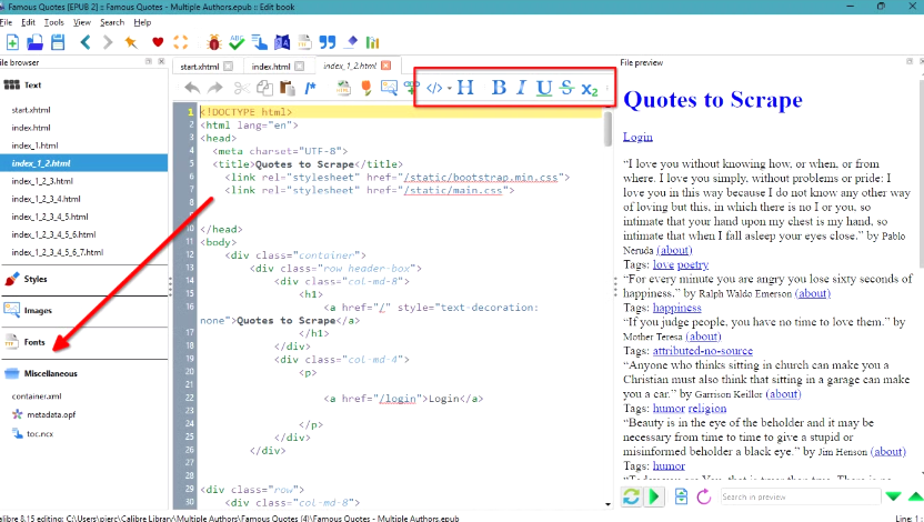 (4) 창에 있는 HTML 페이지를 클릭하면 전자책 출력을 미리 볼 수 있습니다. 가운데 패널에는 텍스트 서식을 지정하거나 수정할 수 있는 HTML 코드가 있습니다. 텍스트 트리 아래에서 HTML 파일의 순서를 변경하여 책에 표시되는 페이지 순서를 변경할 수도 있습니다.