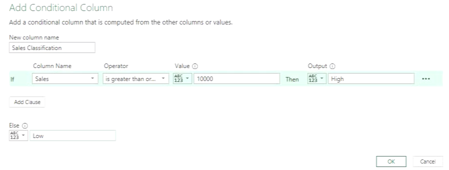 기존 '판매' 열을 기반으로 '판매 분류' 라는 새 열을 만들고 , 10,000달러 이상의 판매액은 "높음"으로, 그 외 모든 값은 "낮음"으로 분류한다고 가정해 보겠습니다. Power Query 편집기의 '열 추가' 탭에서 '조건부 열'을 클릭합니다.