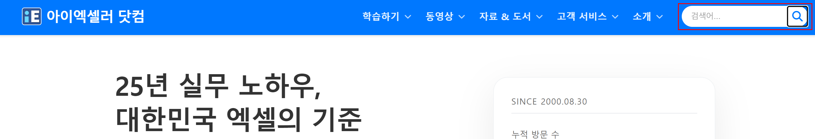 이 때 나타나는 검색 결과는 '아이엑셀러 닷컴' 사이트에 올라와 있는 모든 콘텐츠를 대상으로 합니다(포스트, 엑셀 파일, zip 압축 파일 등).