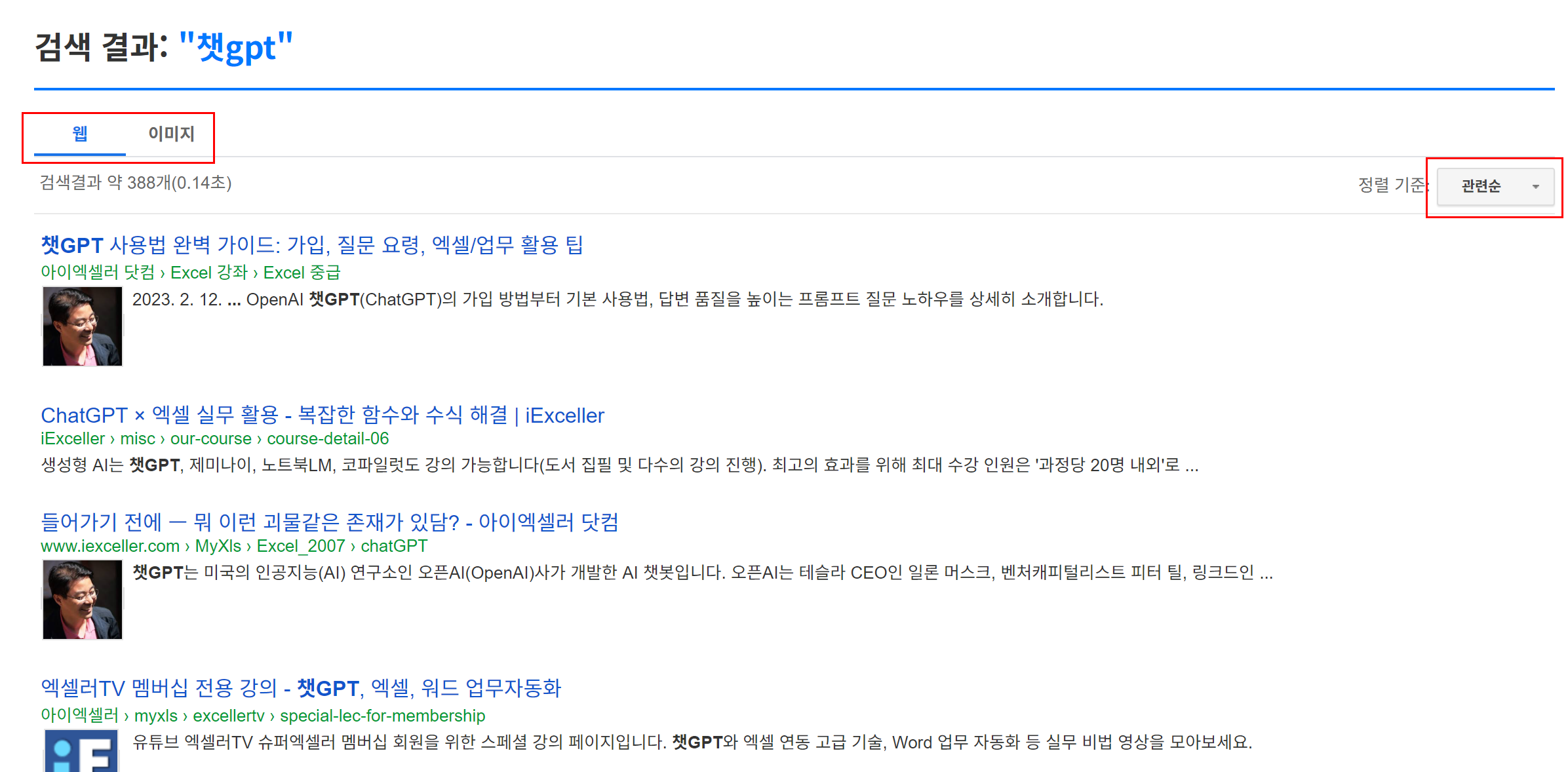 결과 화면 왼쪽 위에 있는 탭을 이용하여 '웹 페이지'나 '이미지'를 대상으로 결과를 볼 수도 있습니다. 오른쪽 위의 드롭다운을 사용하여 '관련순'이나 '날짜순'으로 결과를 정렬하는 것도 가능합니다.