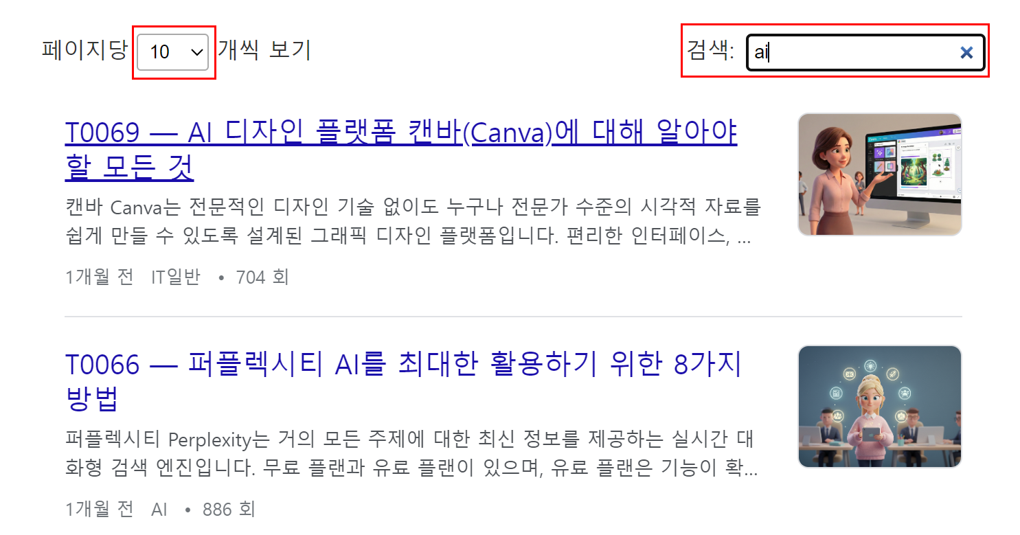 또한 화면 왼쪽 상단의 드롭다운을 이용하여, 화면에 표시되는 결과물의 갯수를 조절할 수 있습니다. 최소 10개부터 최대 100개까지 5가지 옵션 중에서 선택할 수 있습니다.