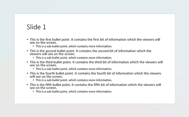 - 너무 많은 텍스트를 피하고 더 큰 글꼴을 사용합니다. 슬라이드에 텍스트가 많아 글꼴이 너무 작은 경우 입력한 내용을 두 개의 슬라이드로 분할하거나 콘텐츠 양을 줄입니다.