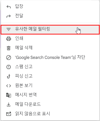 받은 편지함의 이메일에서 직접 필터를 만들 수도 있습니다. 만들고자 하는 필터 기준과 일치하는 이메일을 엽니다. 보낸 사람 정보 오른쪽 옆에 있는 더보기 아이콘(점3개)을 클릭하고 [유사한 메일 필터링] 메뉴를 선택합니다.