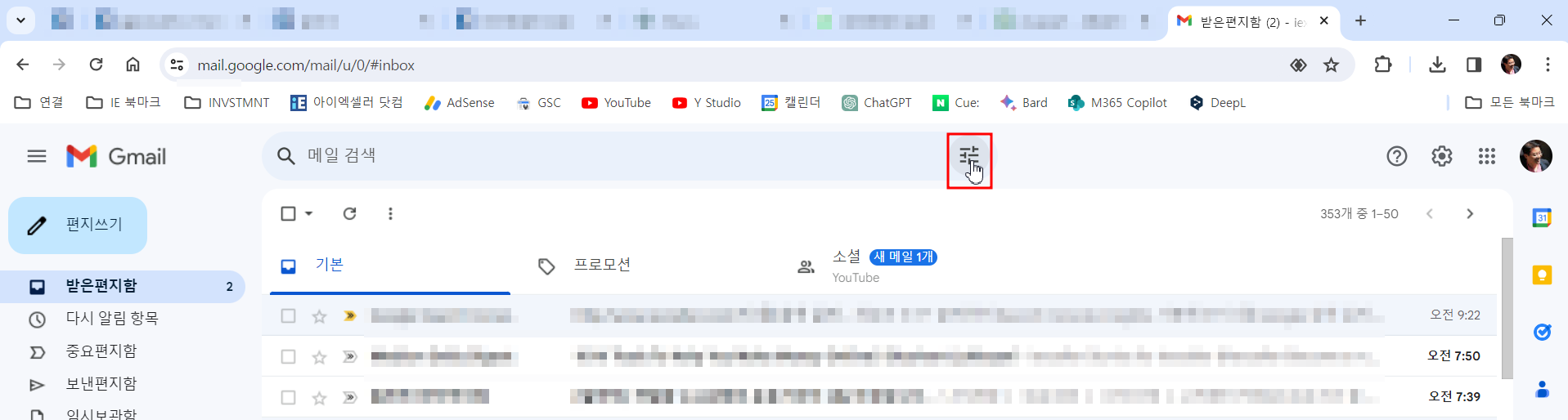 Gmail에서 필터를 만드는 방법에는 여러 가지가 있지만 가장 쉬운 방법은 검색창을 사용하는 것입니다. Gmail에서 받은편지함 상단으로 이동하여 [메일 검색]란 오른쪽에 있는 [검색옵션 표시] 아이콘을 클릭합니다.