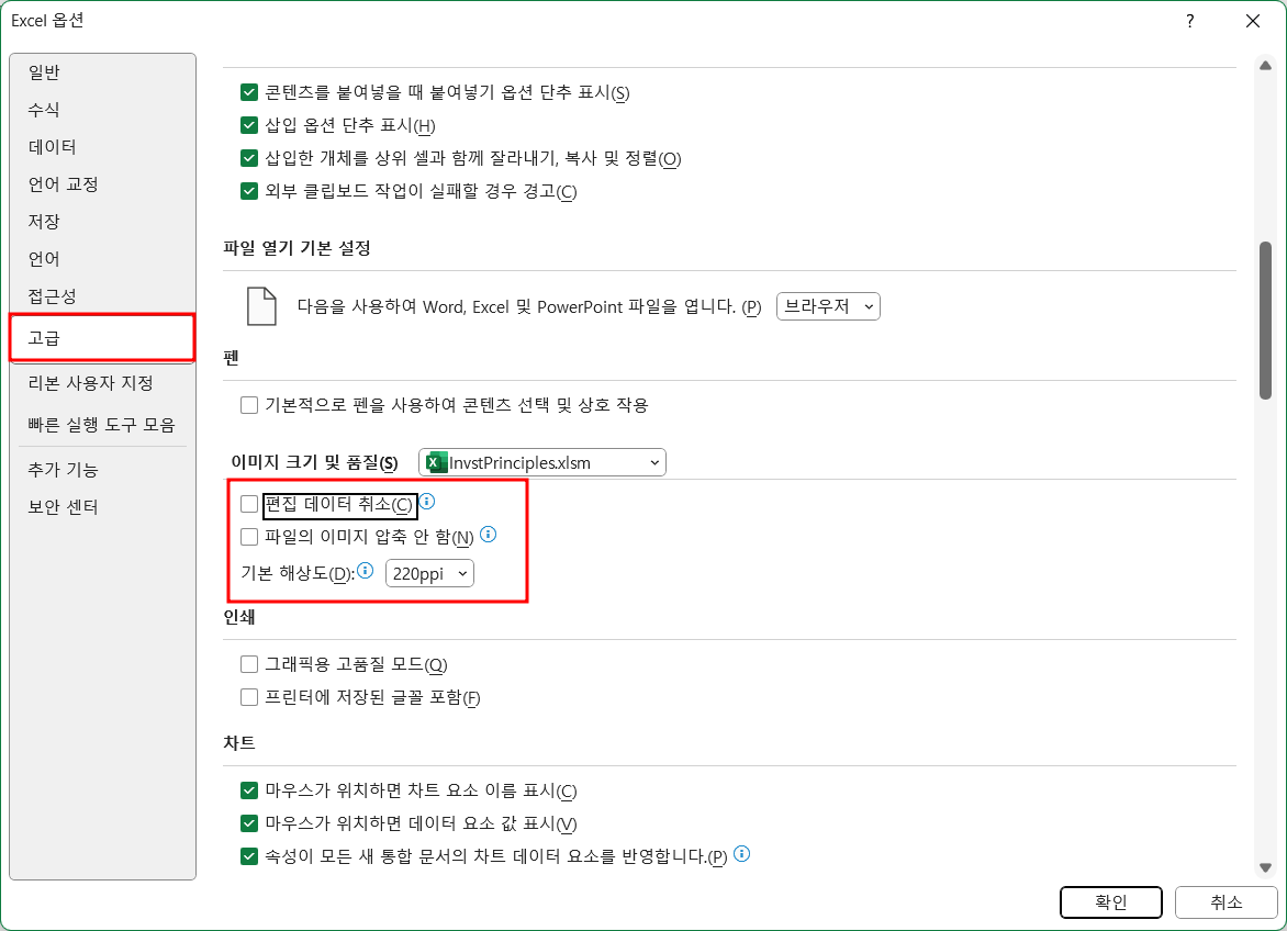 - 이미지 압축: [파일의 이미지 압축 안 함]을 선택 취소하면 Excel이 문서의 이미지를 압축할 수 있습니다. 이는 Excel에서 이미지의 파일 크기를 줄여 통합 문서의 전체 파일 크기를 크게 줄일 수 있음을 의미하며, 특히 이미지가 많거나 큰 경우에는 더욱 그렇습니다.