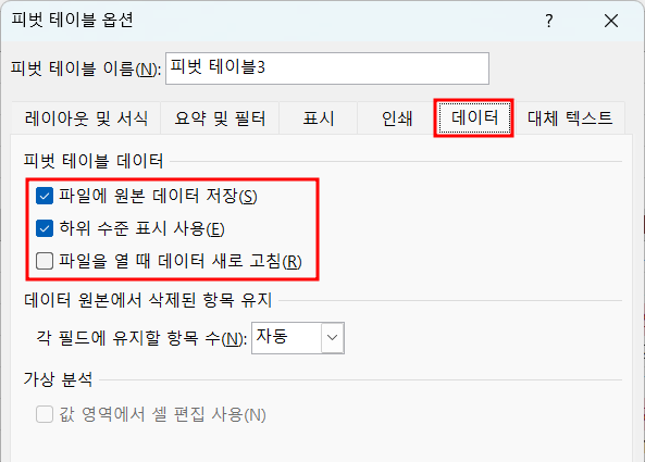 - [피벗 테이블 옵션] 대화상자의 [데이터] 탭에서 필요한 항목 값을 지정합니다.