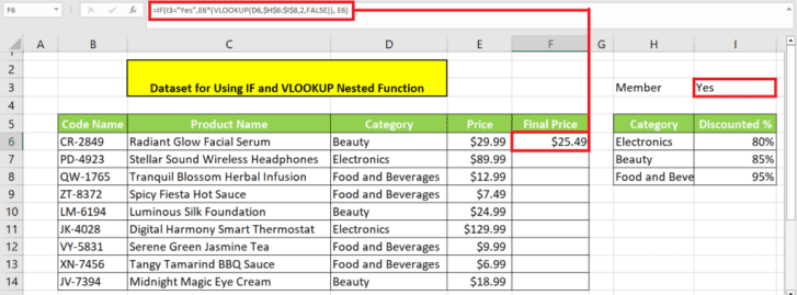 데이터에 가격 열을 추가했습니다. 회원 가격에 대한 다른 열을 추가해야 합니다. 회원에게는 전자제품 20% 할인, 뷰티제품 15% 할인, 식음료 5% 할인이 제공됩니다. 고객이 회원인 경우 VLOOKUP 수식은 테이블을 기반으로 할인된 가격을 계산합니다. 그렇지 않은 경우 원래 가격을 반환합니다. 이 계산에 사용하는 수식은 다음과 같습니다.