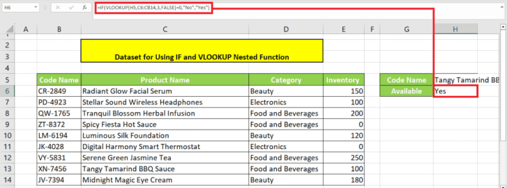 =IF(VLOOKUP(H5,B6:E14,4,FALSE)=0,”No”,”Yes”)