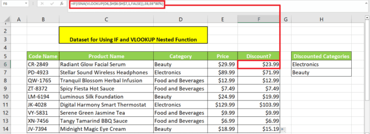 =IF(ISNA(VLOOKUP(D6,$H$6:$H$7,1,FALSE)),”Not Discounted”, “Discounted”)