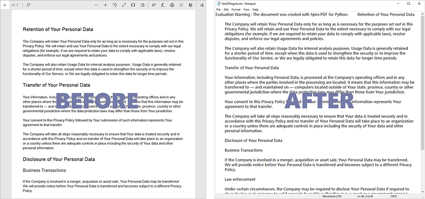 라이브러리에는 PDF 문서의 처음 10페이지에서만 텍스트를 추출할 수 있는 제한이 있습니다. 또한 생성된 텍스트 파일에는 "평가 경고"라는 줄이 포함되어 있습니다: 이 문서는 Python용 Spire.PDF로 작성되었습니다."라는 줄이 있습니다. 이러한 제한을 제거하려면 공급업체로부터 30일 평가판 라이선스를 받는 옵션이 있습니다.