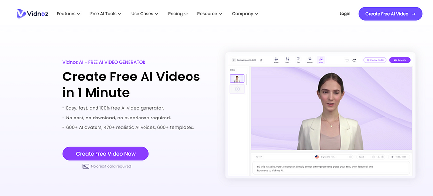 비드노즈 AI(Vidnoz AI)는 AI 동영상 생성기로, 1분 안에 AI 동영상을 만들 수 있습니다. 무료이며 다운로드할 필요도 없고 초보자도 쉽게 사용할 수 있습니다.