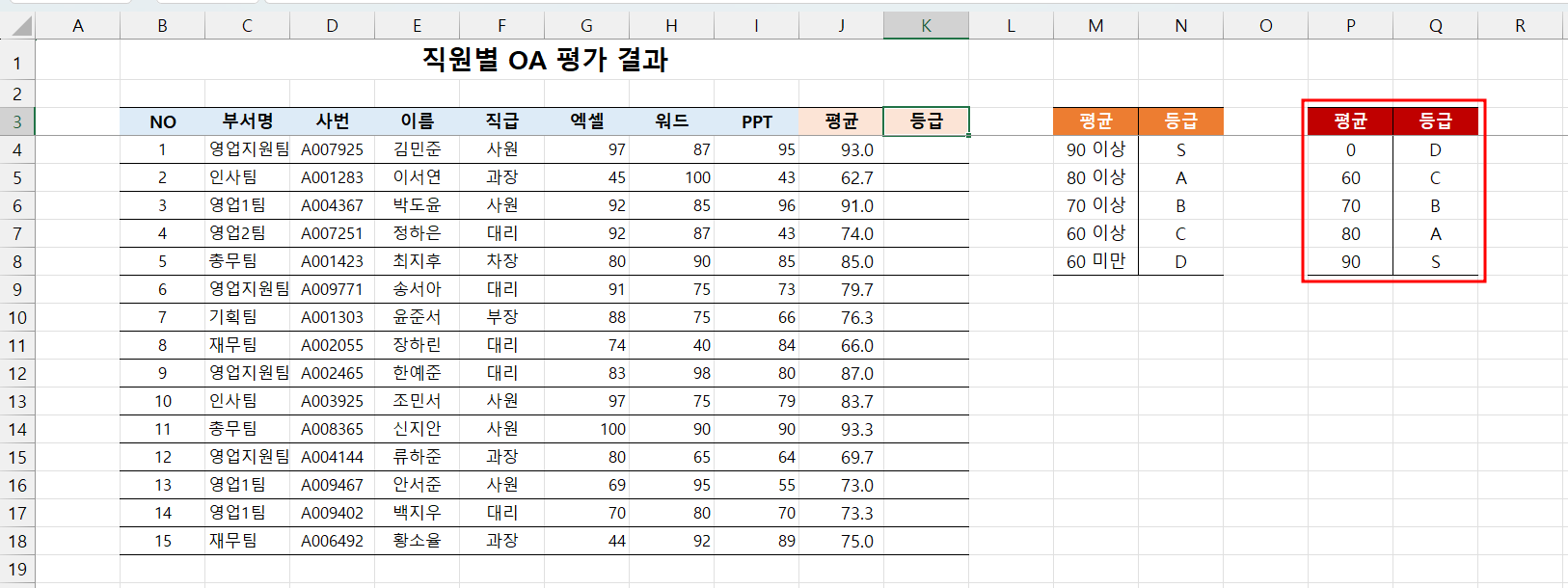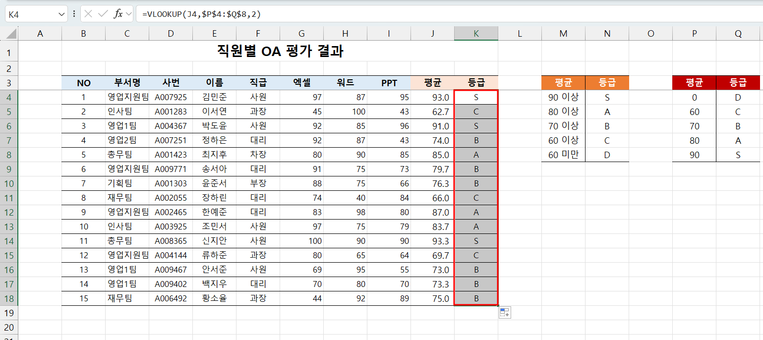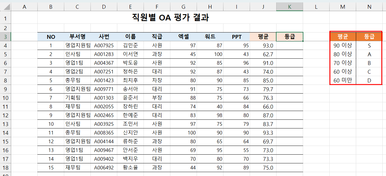 '평균'을 기준으로 '등급'을 매기는데, 90 이상이면 S, 80 이상이면 A, 70 이상이면 B, 이런 식으로 특정한 점수 구간에 따라 등급을 책정하고자 합니다. 이런 문제도 VLOOKUP 함수를 이용하여 해결할 수 있습니다.