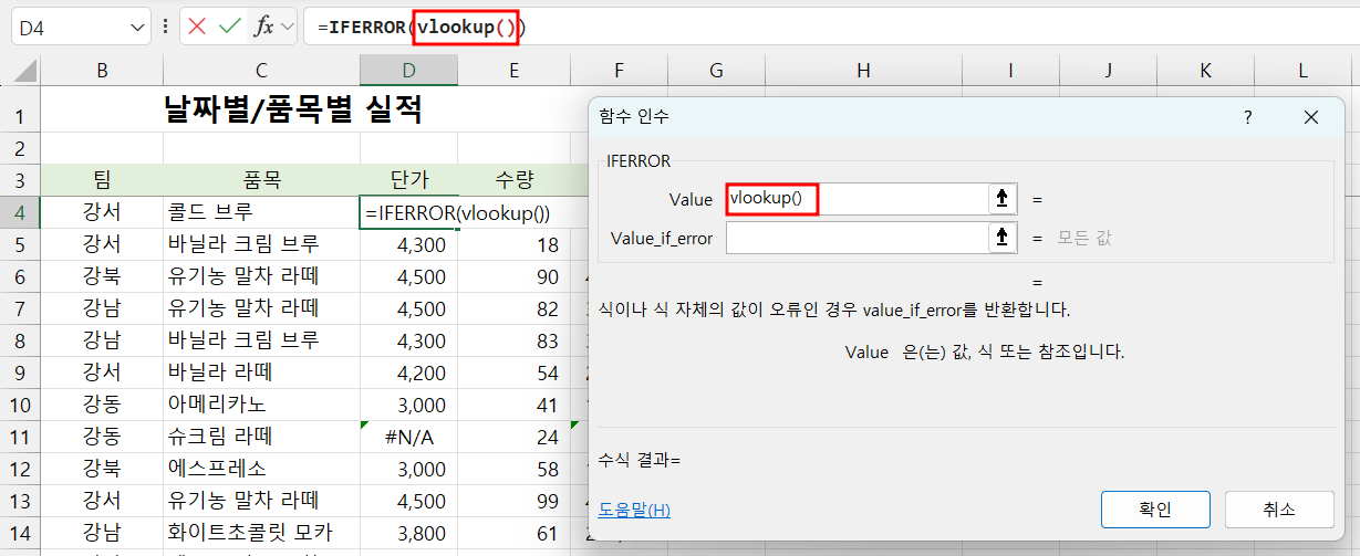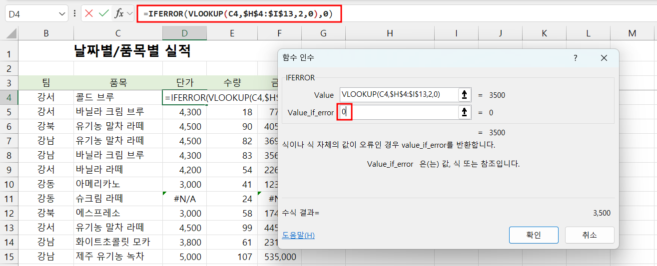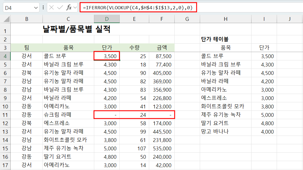 단가 테이블에 정보가 없는 품목인 경우에도 오류가 표시되지 않고 지정한 값(0)이 표시되므로 다른 수식에 영향을 미치지 않습니다. 사용자는 나중에 단가가 0인 품목만 확인해서 단가 테이블에 업데이트를 하면 됩니다. 물론 수식의 범위에 수정이 있다면 수식에도 반영해야 합니다.