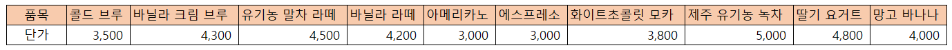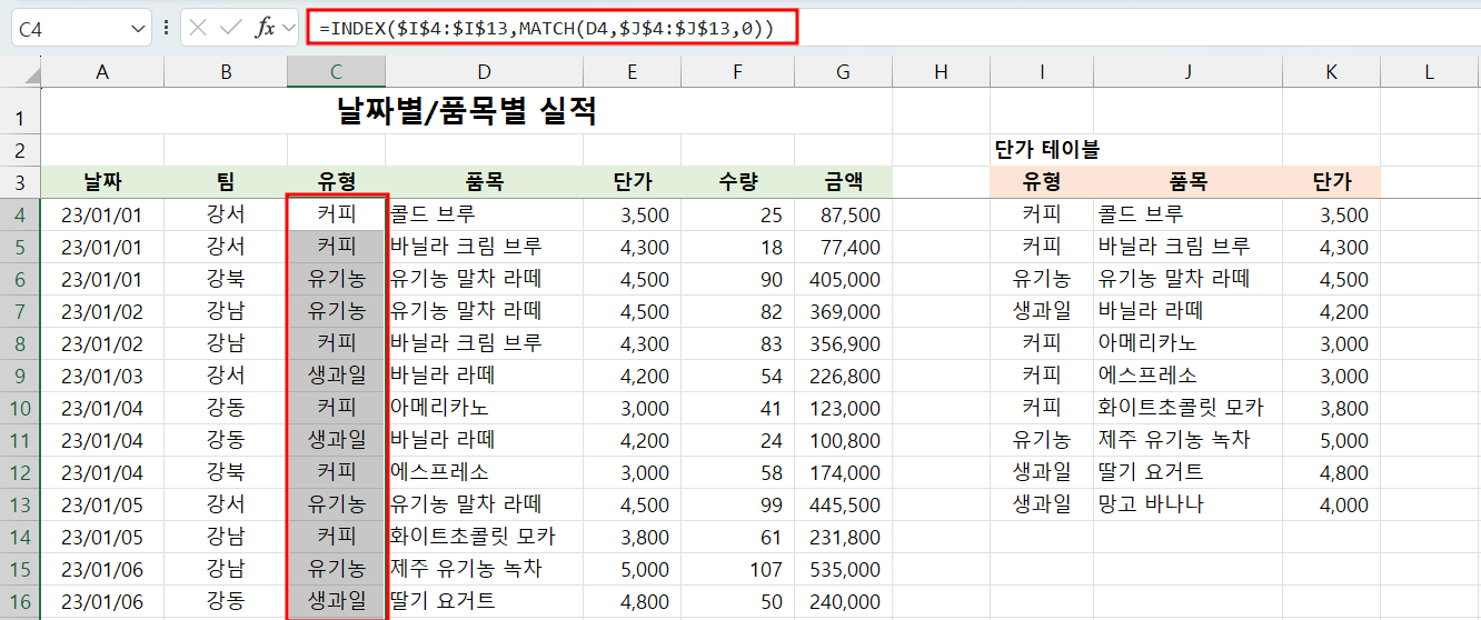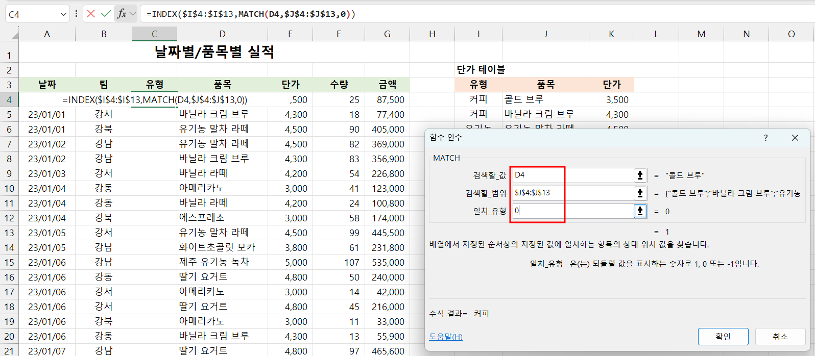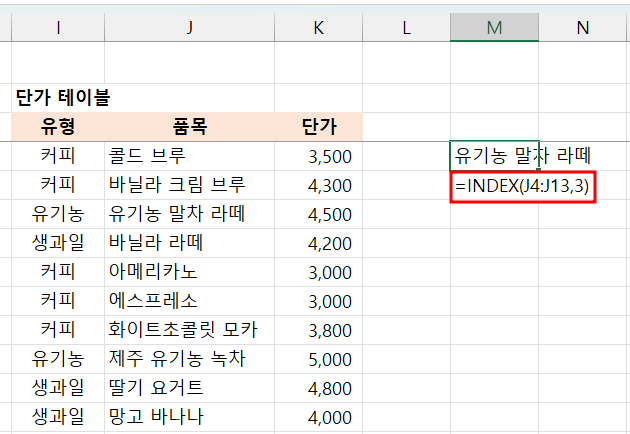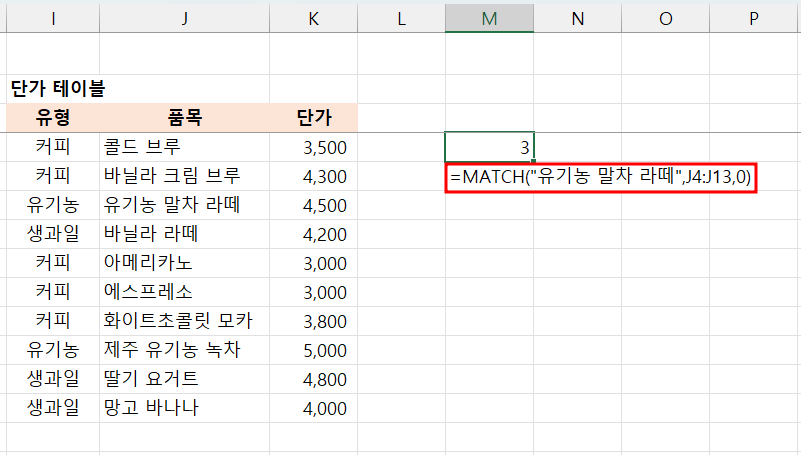 [단가 테이블]에서 '품목' 중에서 3번째 행에 있는 값을 가지고 오려면 '=MATCH("유기농 말차 라떼",J4:J13,0)'라는 수식을 사용합니다.