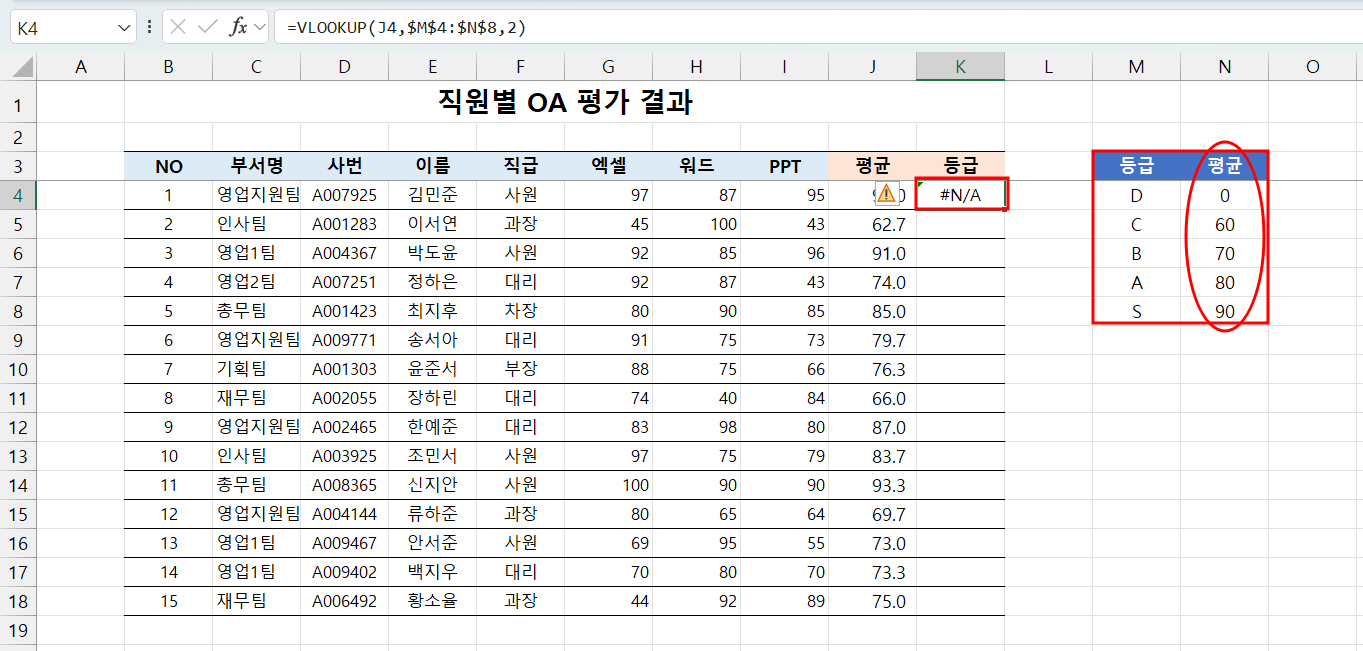 문제는 수식에 있지 않습니다. VLOOKUP 함수의 '참조 테이블(표_범위)'에 있습니다. 이전의 경우와 비교해 보면, 앞에서는 '평균' 다음에 '등급'이 있었는데, 이번에는 반대로 되어 있기 때문입니다. 다시 한 번 강조하지만, VLOOKUP 함수는 기준이 되는 열(일치하는 값이 있는 열)의 왼쪽에 있는 값은 찾지 못합니다.