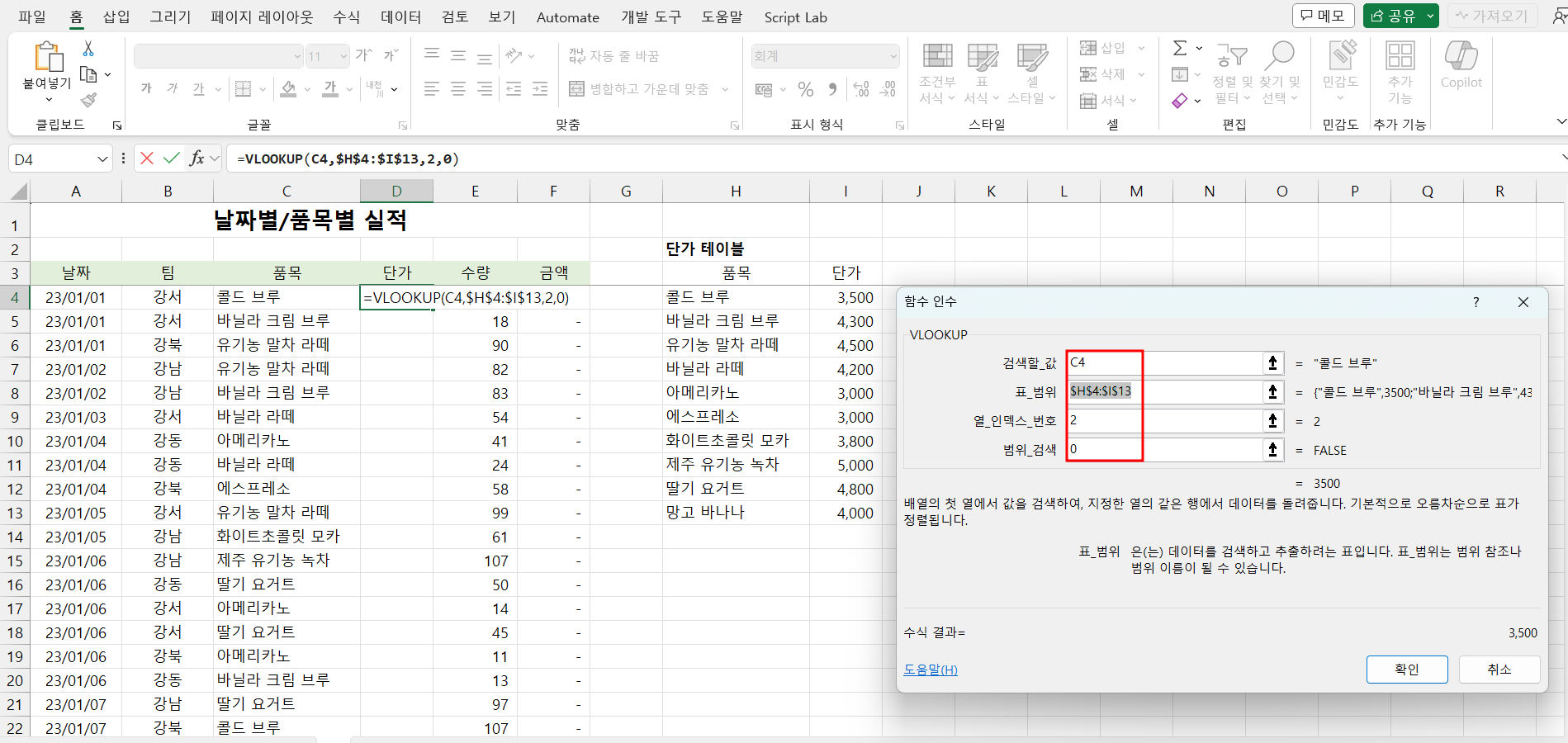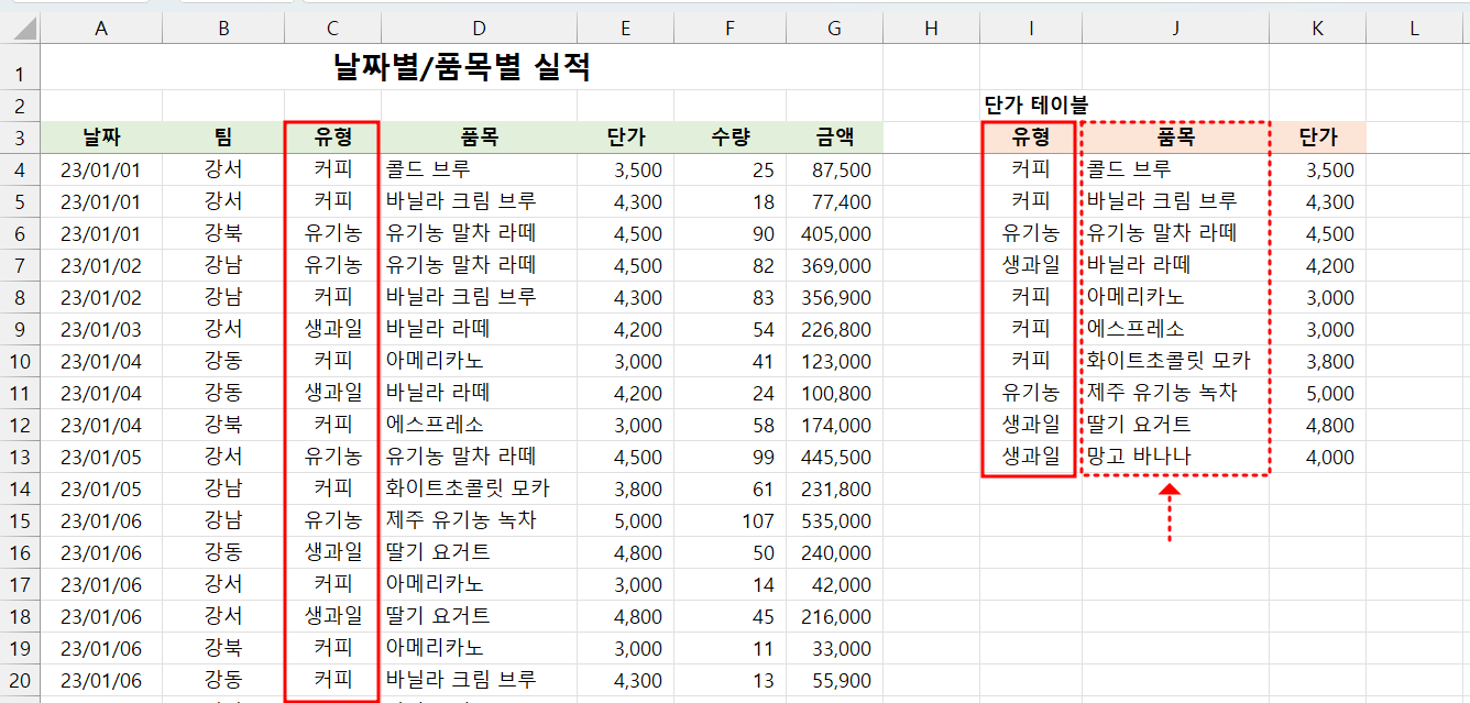 어떤 품목의 단가가 변동될 경우, '단가 테이블'만 수정하면 '날짜별/품목별 실적' 테이블은 자동으로 업데이트되어야 합니다. 이런 경우에 사용할 수 있는 함수가 VLOOKUP입니다.