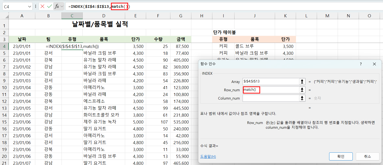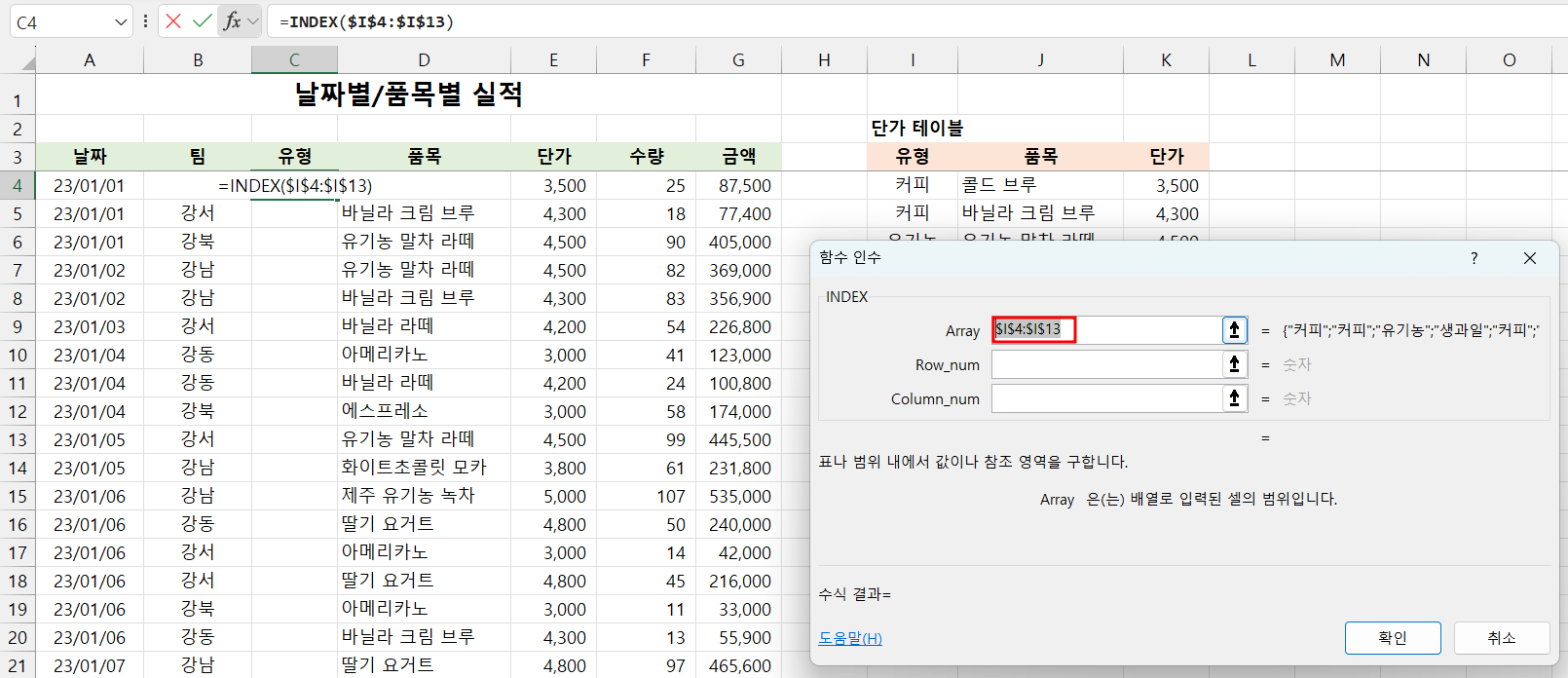 (7) 수식 입력줄에서 INDEX 함수를 선택하면 INDEX 함수 대화상자로 바뀝니다. [확인] 버튼을 클릭하면 C4 셀에 유형('커피')이 표시됩니다. 다른 셀에 대해서도 수식을 채워 넣기하여 완성합니다. 최종 완성 수식은 아래와 같습니다.