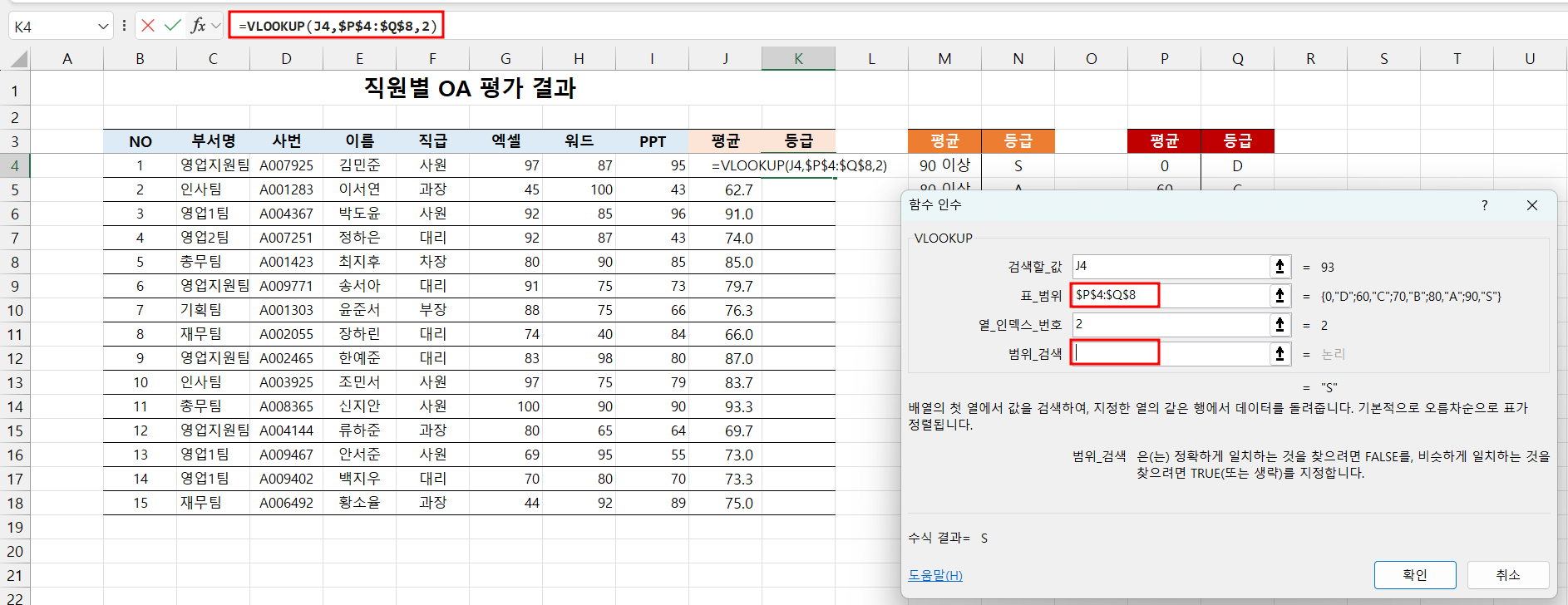 (4) '표_범위'를 (1)에서 작성한 테이블로 지정하고, '범위_검색'을 생략(또는 1)하는 점이 앞에서와 다릅니다.