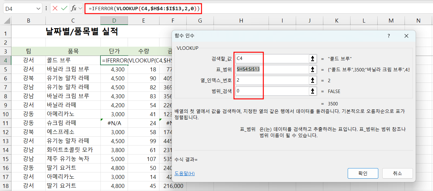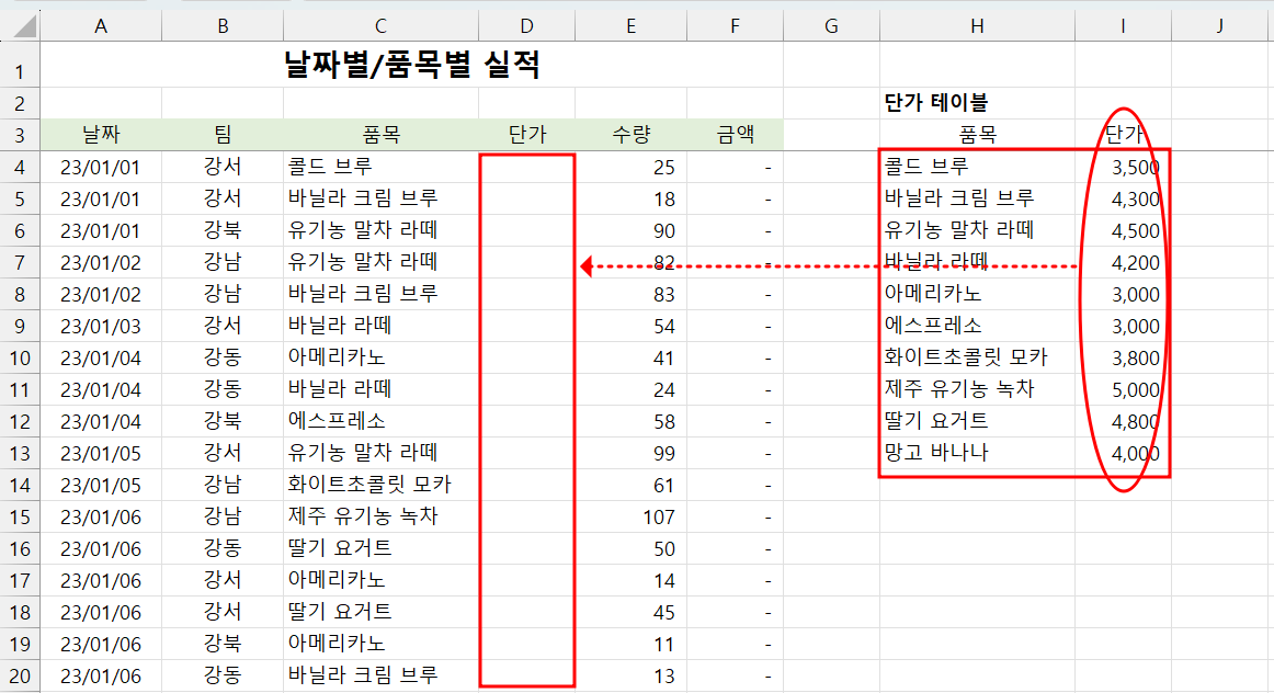 수식을 작성하기에 앞서, [날짜별/품목별 실적] 테이블의 '단가' 셀(D4)에 원하는 값을 가지고 오려면 어떻게 접근하면 될 지 말로 설명해 보세요. 길동이에게 말로 전달한다면 이런 식이 될 겁니다.
