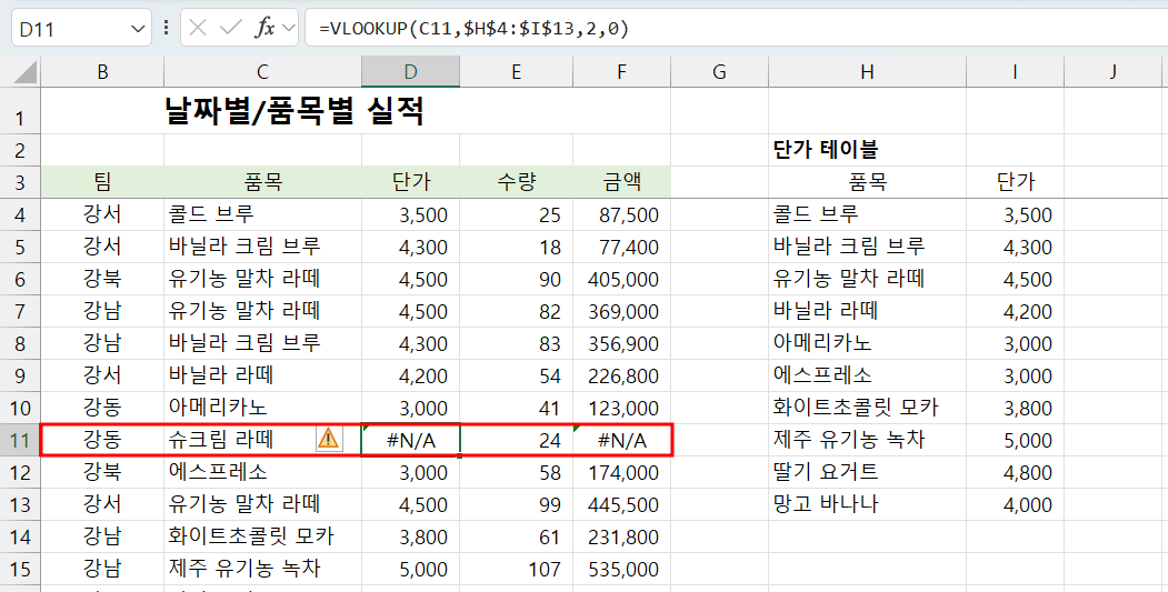 이달의 신제품으로 '슈크림 라떼'가 출시되었습니다. [날짜별/품목별 실적] 테이블에는 실적이 있지만 [단가 테이블]에는 신제품 정보가 없습니다. 이런 경우 VLOOKUP 함수를 사용하면 '#N/A'오류가 나타납니다. 'Not Available'의 줄임말로, 유효하지 않은 값이 들어왔다는 뜻입니다.
