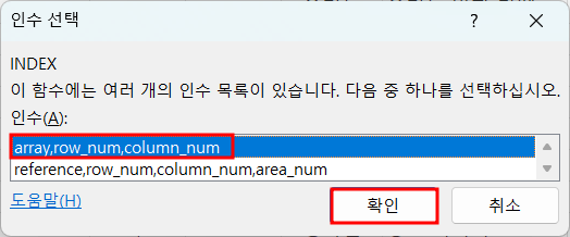 (3) 인수 선택 대화상자에서 'array,row_num,column_num'을 선택하고 [확인]을 누릅니다.