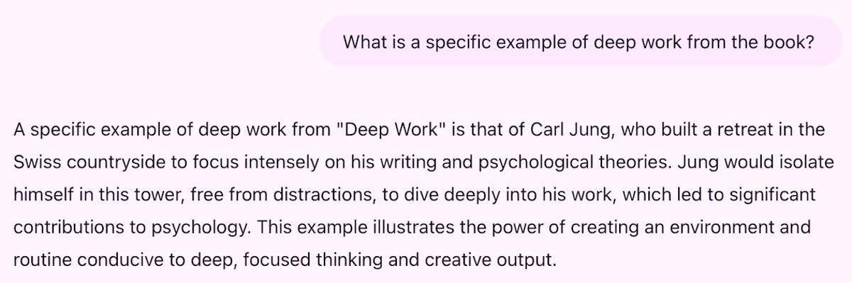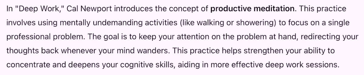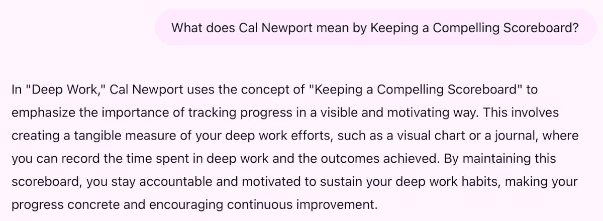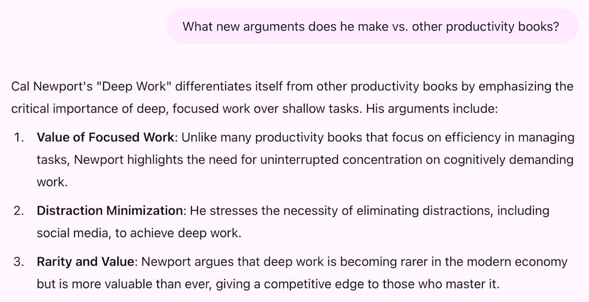 AI에 대해 제가 배운 것이 있다면, 사전 프롬프트 사고가 첫 번째 프롬프트만큼 중요하다는 것입니다. 그저 책의 방대한 요약을 원한 것이 아니었습니다. 뉴포트의 심층 작업에 대한 큰 아이디어, 주장, 전략 및 프레임워크를 배우고 싶었고, 이를 제 작업에 적용하고 싶었습니다. 그래서 저는 기대치를 설정하면서 채팅을 시작했습니다.